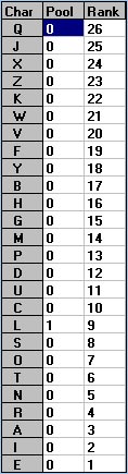 just me an email at: You can read the Help File to see how to use the program. To the right here, for example, is the Charpool Window. It shows you how many of each character is left to use up (from your quote). You can sort it by least-common-characters, to help you use up the more rare characters first. When you have all zeros, as in the picture to the right, the puzzle is done! |