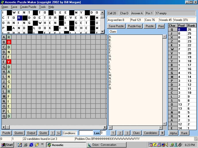 At the bottom is an important read-out: the "problem chars" remaining. These are simply the least-common-third of the alphabet. You want to get rid of these as soon as possible. The quotes button will let you edit your file of quotations. You can save the puzzle and load it up later. You can save the puzzle as a text file and send it to someone in email! You can make custom puzzles for friends and family. The print-out routines are still crude and unfinished. If you want to be notified when the full version is done, just email me : prema@prahlad.org.